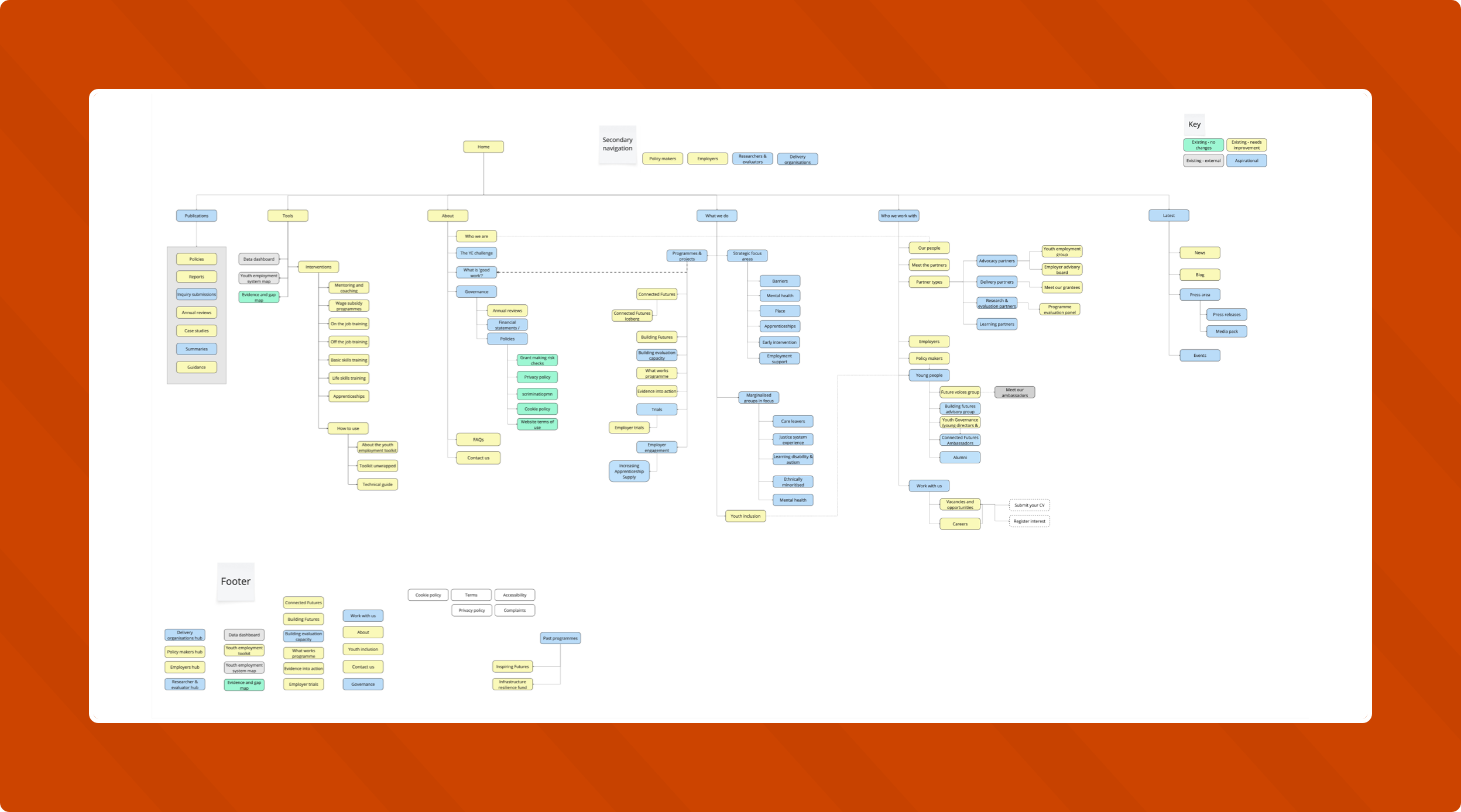 We kicked off the project in London with a hands-on session to align on goals and understand the specific hurdles facing YFF’s users. The critical task? A physical card sort of the entire existing sitemap. By physically regrouping pages into logical pockets of information with the YFF team, we rapidly identified what to keep, cut, or consolidate, ensuring the new structure was solid from day one.